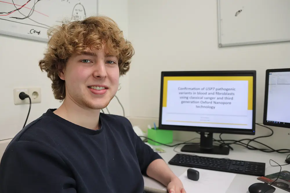Bart Hulsenbosch (5 maanden stage), werkt aan de bevestiging van pathogene varianten in het USP7-gen in fibroblasten van patiƫnten met het HAFOUS-syndroom. Bart maakt gebruik van verschillende technieken, waaronder standaard Sanger-sequencing, Nanopore-sequencing en long-range PCR.